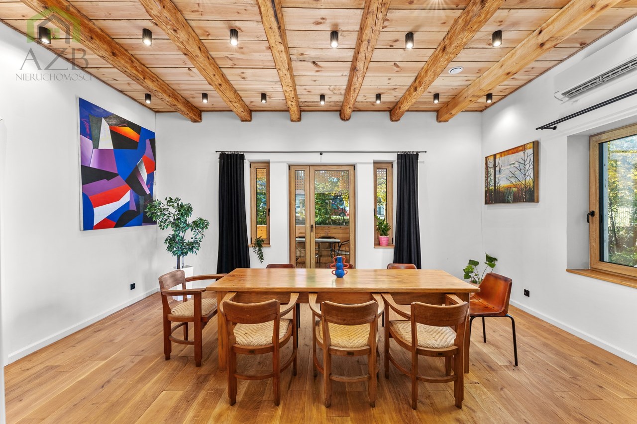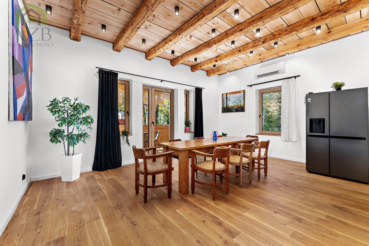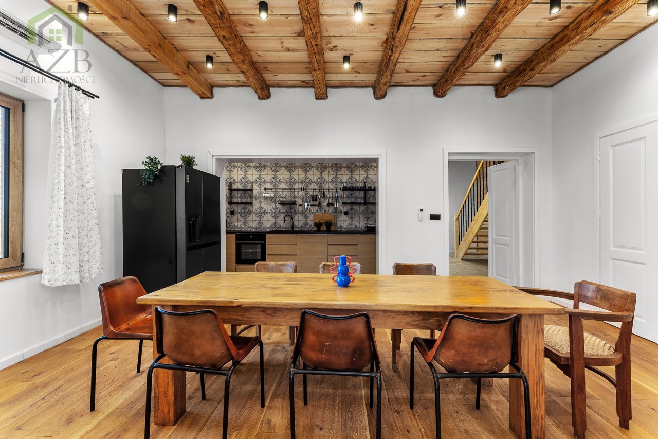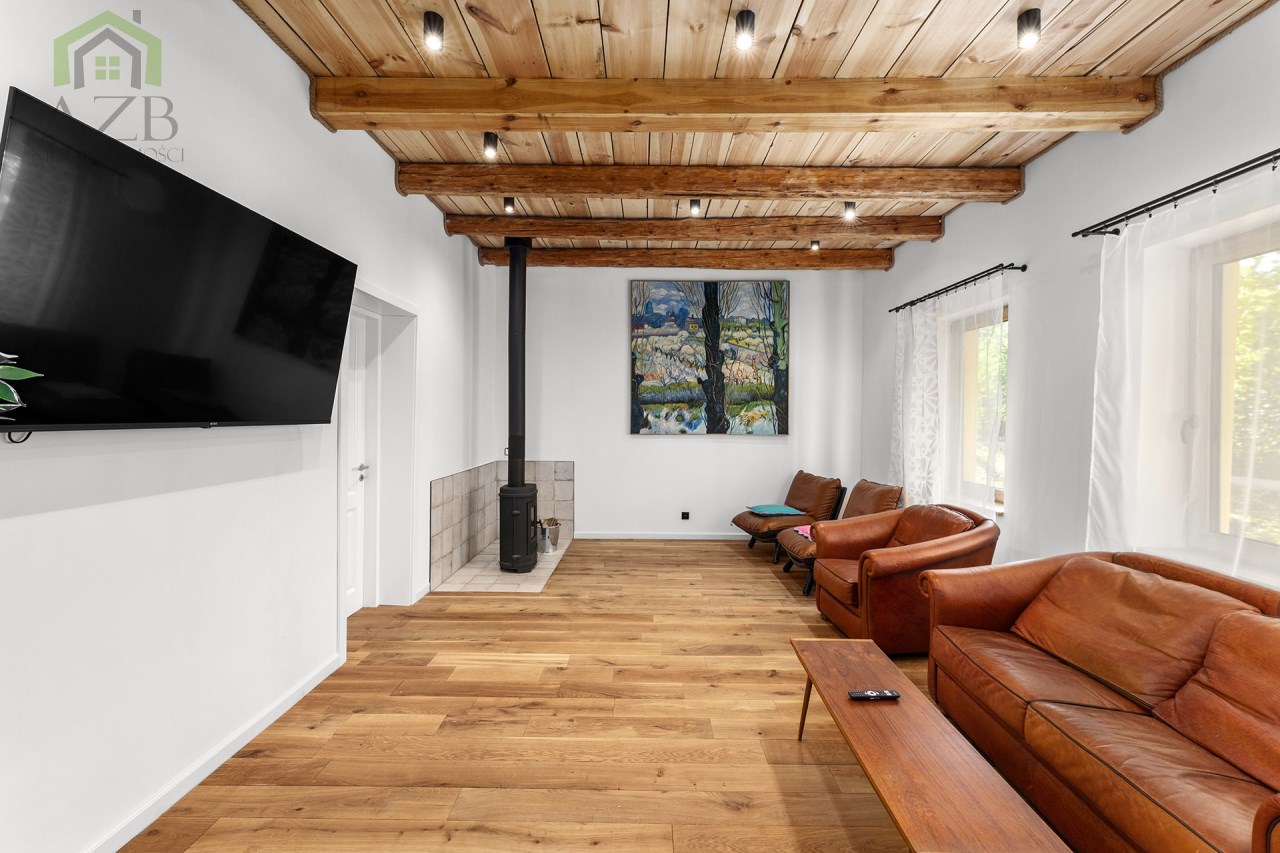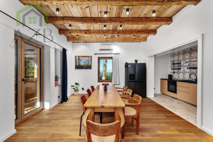 Dom jest bardzo jasny i utrzymany w ciepłej tonacji barw , został gruntownie wyremontowany i zaprojektowany zgodnie z projektem jaki stworzyli obecni właściciele, wymienione zostało praktycznie wszystko , ma ok. 160 m2 powierzchni oraz 45 m2 piwnic do własnej aranżacji ( spa , winiarnia ) , posiada duży parking przed budynkiem. Cały dom jest ogrzewany pompami ciepła nadmuchowymi Panasonic , ogrzewanie podłogowe Danfos w łazience oraz kominek . Drzwi wewnętrzne na zamówienie drewniane , i okna nowe drewniane 3 szybowe , na podłogach drewno dębowe , w budynku jest zastosowana rekuperacja a cały budynek jest monitorowany.