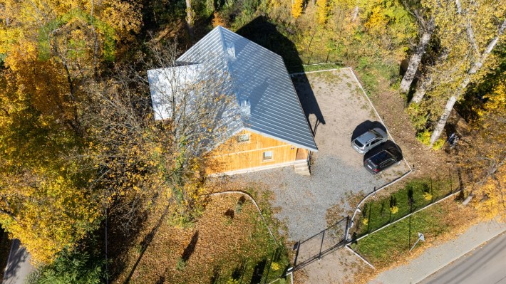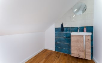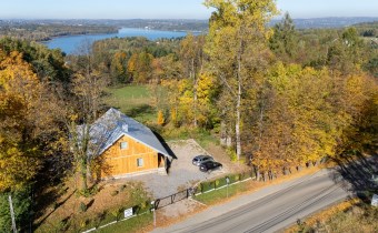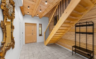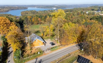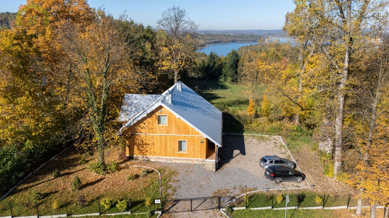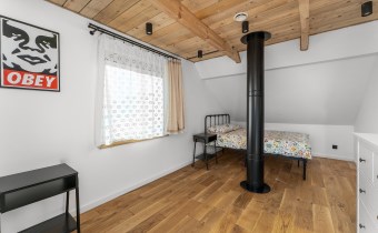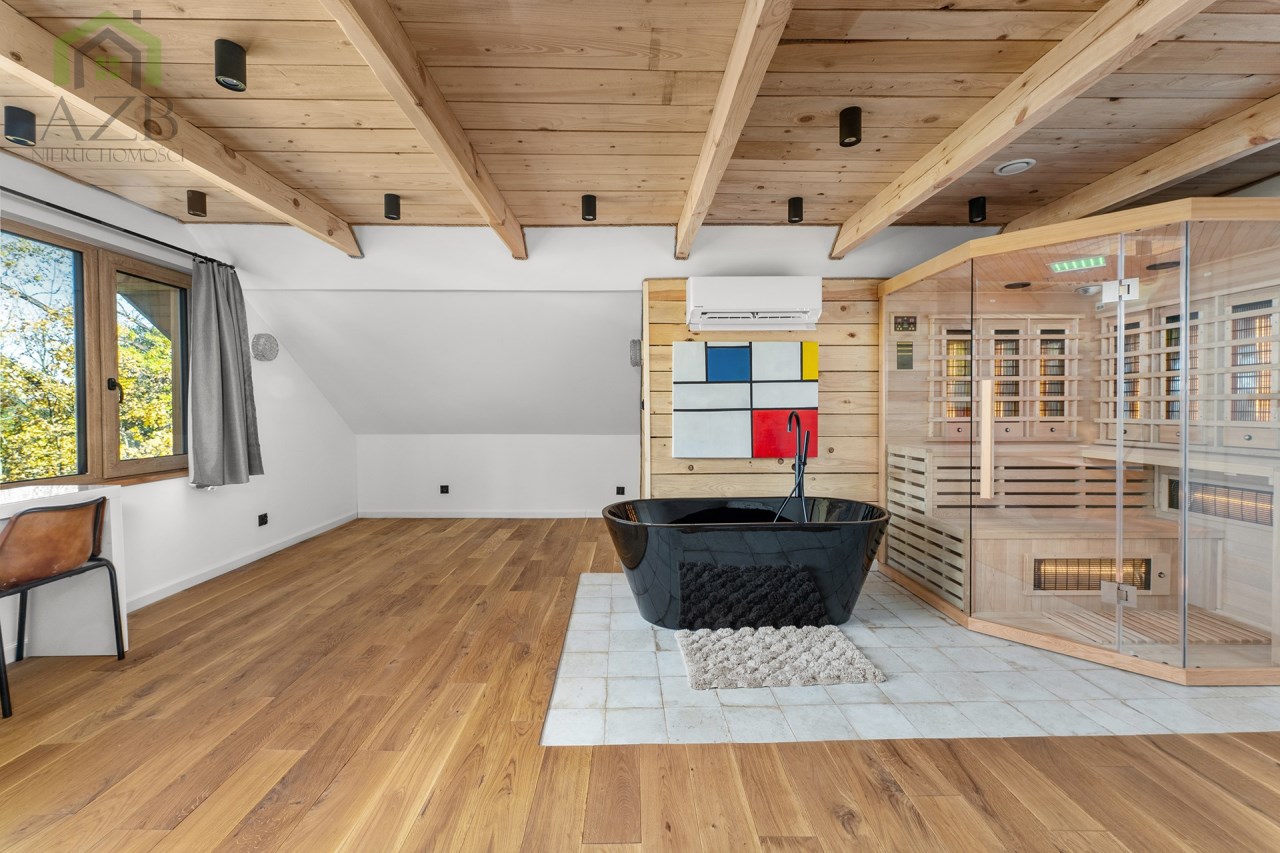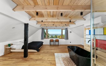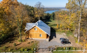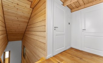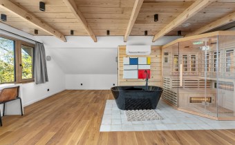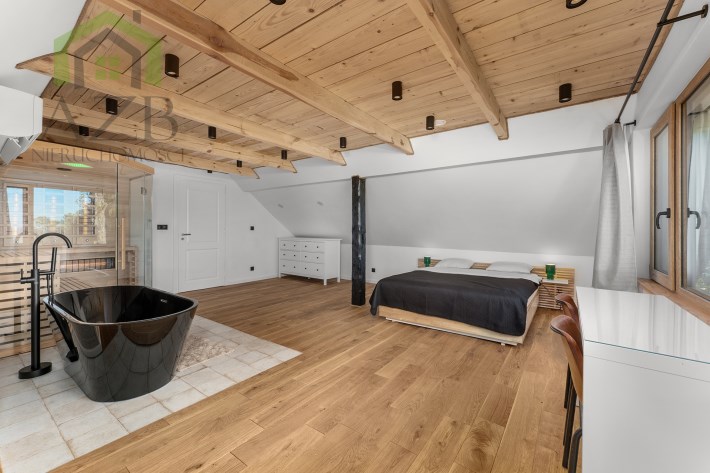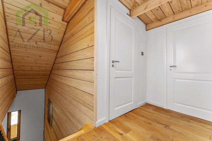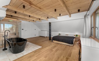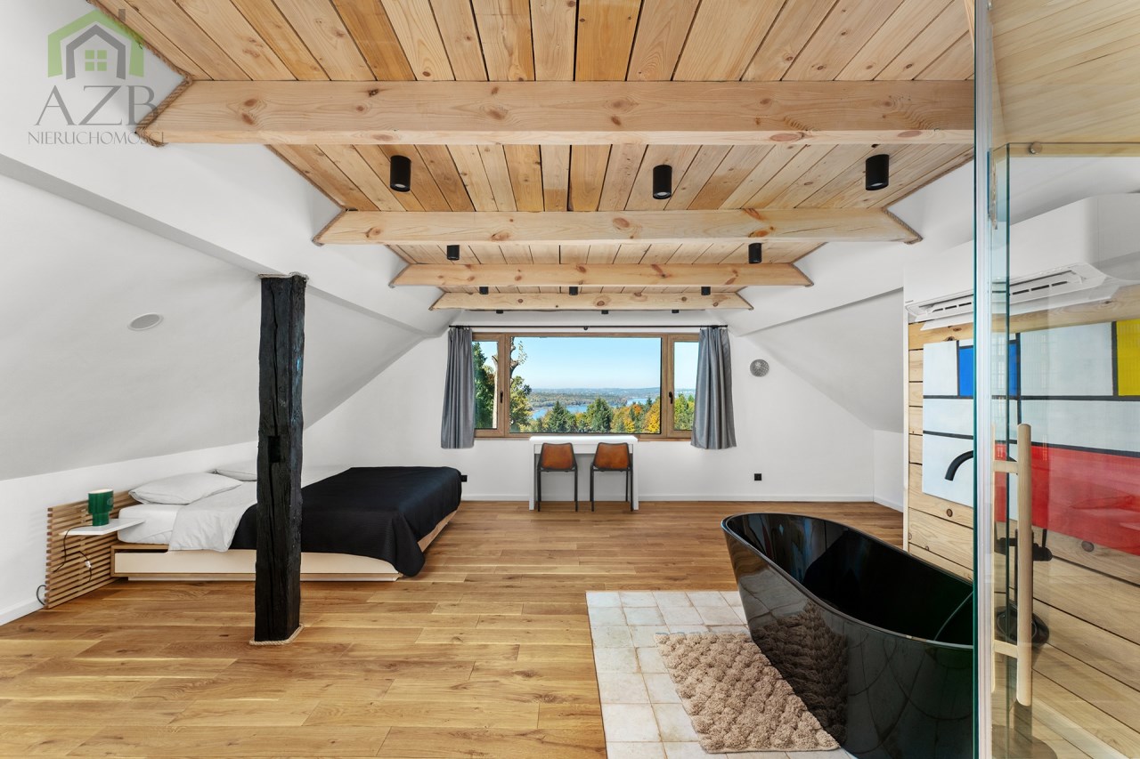 Piętro to : główna sypialnia ( 32 m2 ) z wanną i sauną oraz przepięknym widokiem na całe jezioro, lasy i okolicę , druga sypialnia ( 16 m2 ) , pomieszczenie techniczne oraz hall.