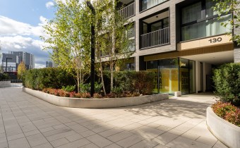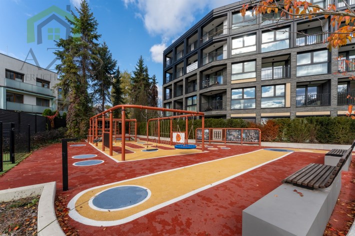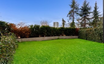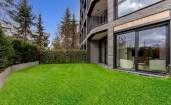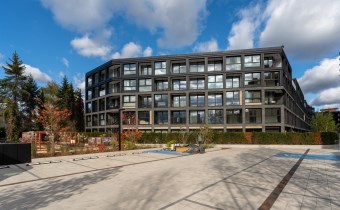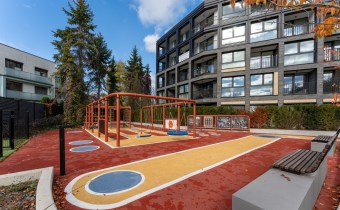 Nowoczesny apartamentowiec o wysokim standardzie wykończenia, otoczony zielenią i elegancko zaprojektowaną przestrzenią wspólną. Przemyślane nasadzenia, alejki spacerowe i elementy małej architektury tworzą przyjazne miejsce do życia.