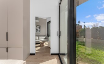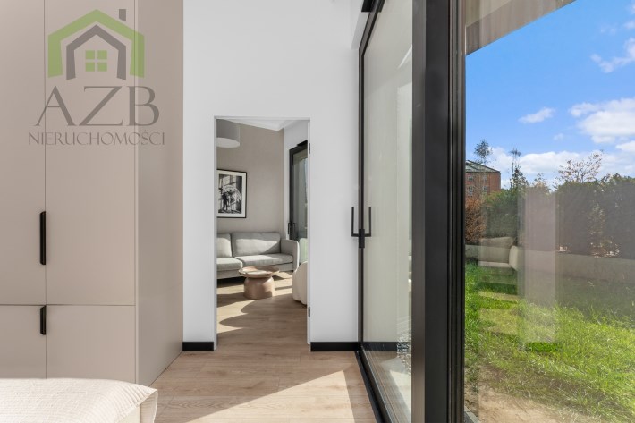Wnętrze łączy ciepłe odcienie beżu, szarości i naturalnego drewna, tworząc harmonijną, spokojną przestrzeń idealną do życia. Wysokie sufity (360 cm) oraz duże przeszklenia zapewniają doskonałe doświetlenie i poczucie przestronności.