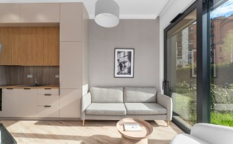 Strefa wypoczynkowa z wygodną, minimalistyczną sofą i dużymi oknami wychodzącymi na zieleń – idealne miejsce na relaks.