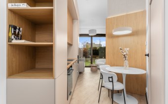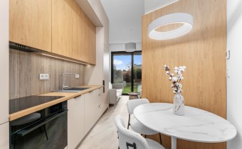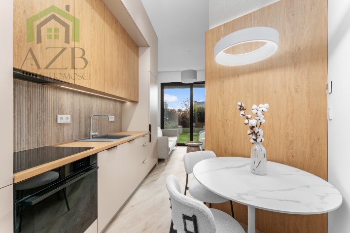 Salon z aneksem kuchennym – jasna, otwarta przestrzeń z wyjściem na ogród. Kuchnia wykonana na wymiar, w eleganckim połączeniu jasnych frontów z drewnianym blatem i nowoczesnym oświetleniem LED.