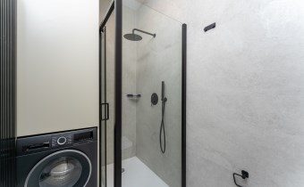 Łazienka urządzona w nowoczesnym stylu z prysznicem i wysokiej jakości armaturą.